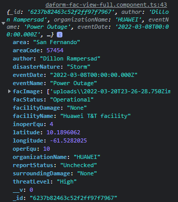 the code above gets the data entry based on the _id and console logs the entire data entry console.log(daFormFac)
