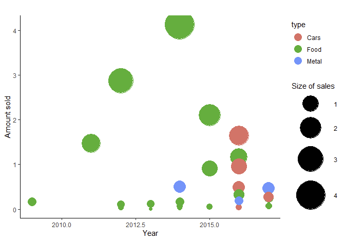I have a scatter plot that includes different colours for different types of sales as well as different sizes based on the amount of the sales. However, the points are currently very small and I want to increase them. Is there a way to increase all points in the chart? I tried adding scale_size_area(scale = 5) but the points keep the same size.