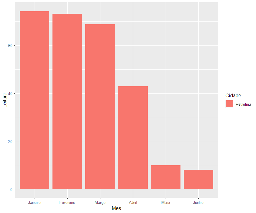 ggplot(de, aes(fill=Cidade, y = Leitura , x = Mes ))+geom_bar(position='dodge', stat='identity')
