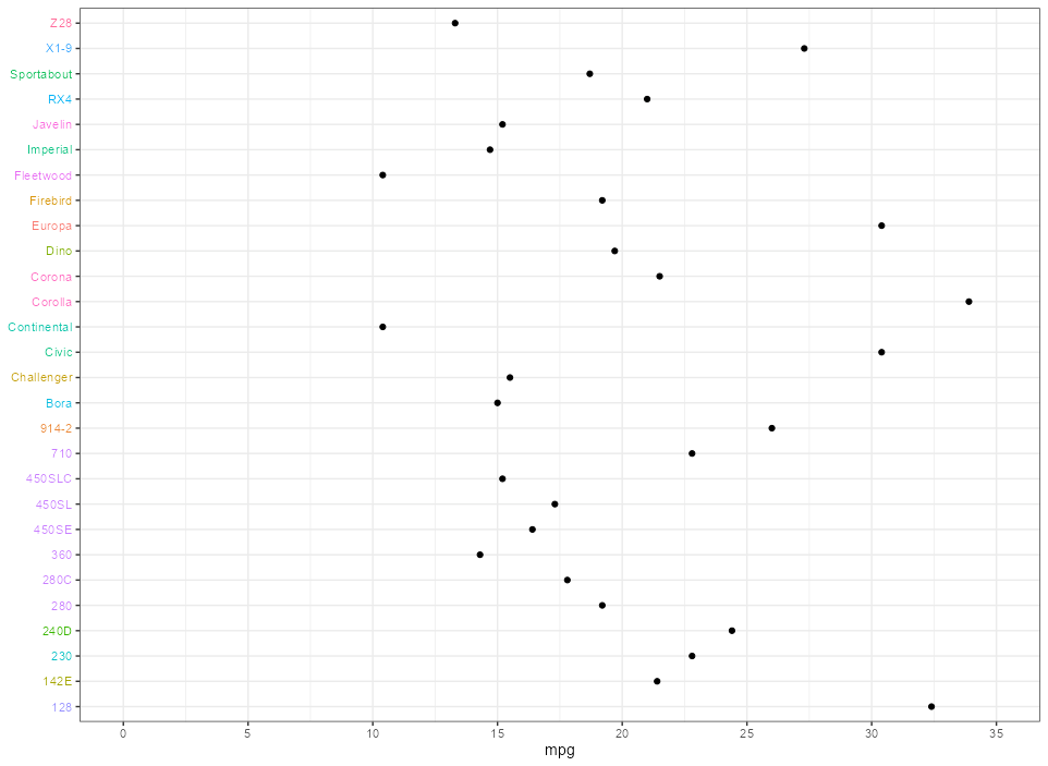 Using tidyverse and the mtcars dataset, I am plotting the model and mpg of each car. I would like the axis text color of each car model to reflect the make of the car (for example, Toyota = red, Cadillac = blue…etc). How can I do this?