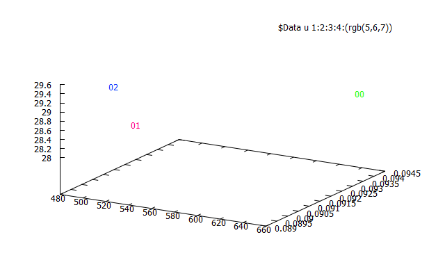 splot $Data u 1:2:3:4:(rgb(5,6,7)) w labels tc rgb var
