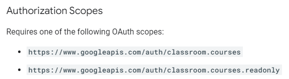 https://accounts.google.com/o/oauth2/v2/auth?scope=https://www.googleapis.com/auth/classroom.courses& response_type=code&redirect_uri=http%3A//127.0.0.1%3A9004&client_id=client_id
