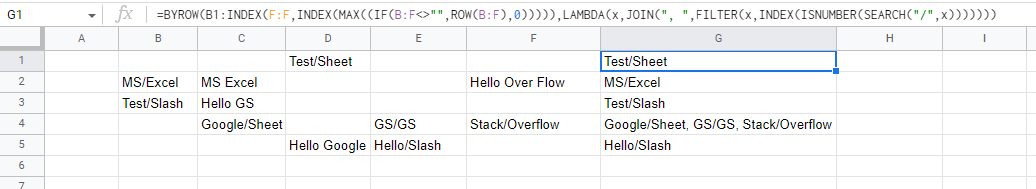 =BYROW(B1:INDEX(F:F,INDEX(MAX((IF(B:F<>"",ROW(B:F),0))))),LAMBDA(x,JOIN(", ",FILTER(x,INDEX(ISNUMBER(SEARCH("/",x)))))))