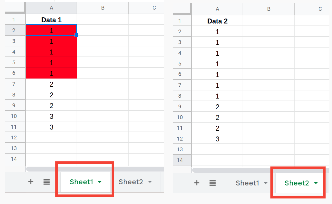 I am having data in two different sheets i.e. Sheet1 Col A and Sheet2 ColA, I want to highlight value in Sheet1 if the count of that value in Sheet1 is less than the count in Sheet2. E.g. in Sheet1 the count of number 1 is 5 and in Sheet2 the count of number 1 is 7 thus 1 should be highlighted in Sheet1. For ease of reference am sharing the image as well as the link of the sheet with desired result.