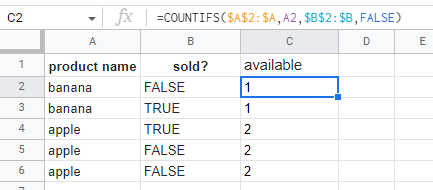 =COUNTIFS($A$2:$A,A2,$B$2:$B,FALSE)