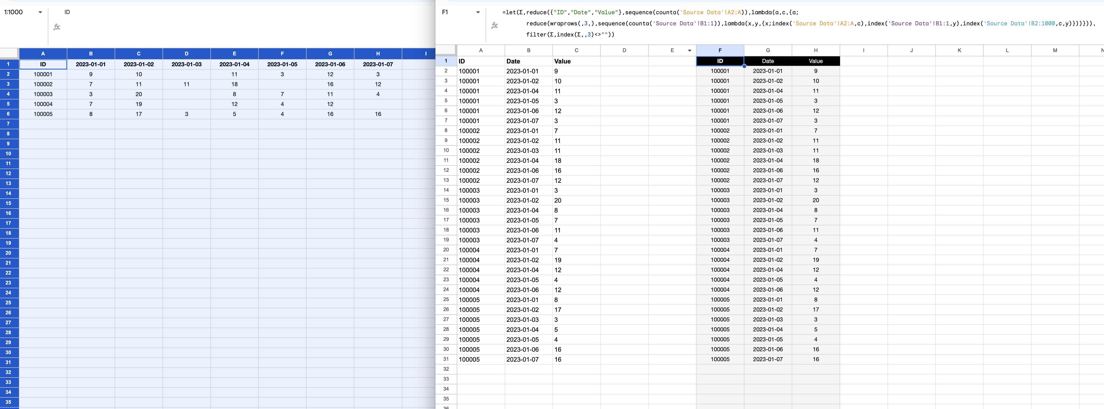 I would like to create a formula in a second sheet to filter and convert this data into the following format so that each ID and date combination is an individual row with the ID in column 1, the date in column 2, and the number value in column 3, skipping the rows where the number value is blank, like this: