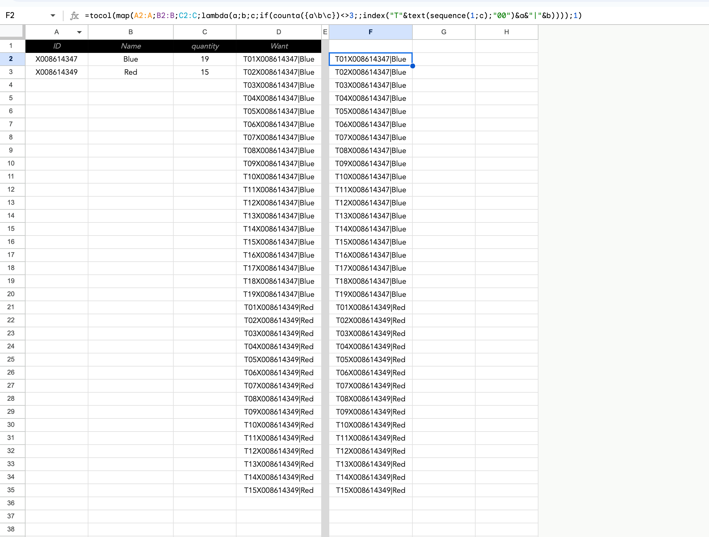 =tocol(map(A2:A;B2:B;C2:C;lambda(a;b;c;if(counta({a\b\c})<>3;;index("T"&text(sequence(1;c);"00")&a&"|"&b))));1)