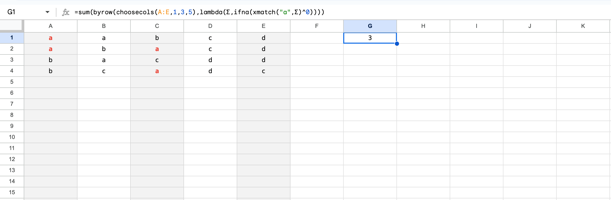 =sum(byrow(choosecols(A:E,1,3,5),lambda(Σ,ifna(xmatch("a",Σ)^0))))