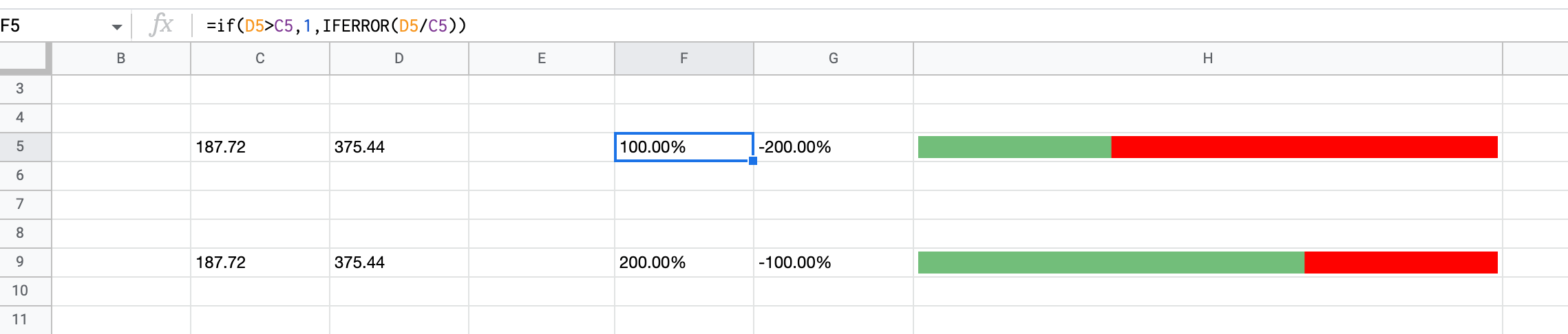 =iferror(sparkline(F5:G5, {"charttype", "bar"; "color1", if(G5=F5, "72BE7A", "72BE7A"); "color2", if(G5<0, "FF0000", "808080"); "negcolor", "808080"}))