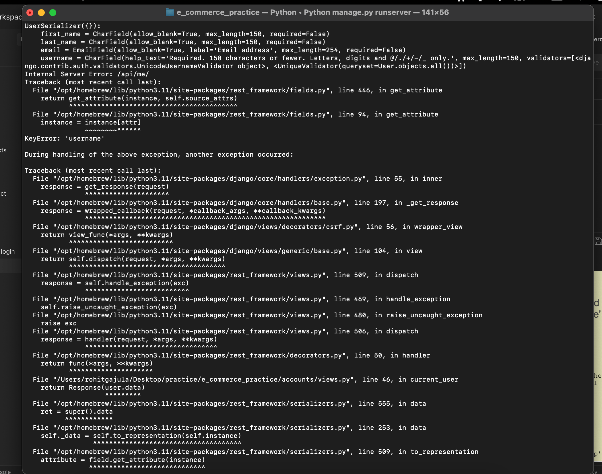 trying to get current user but it shows username keyerror but everything’s all good from my side. Can anyone say whats the error?