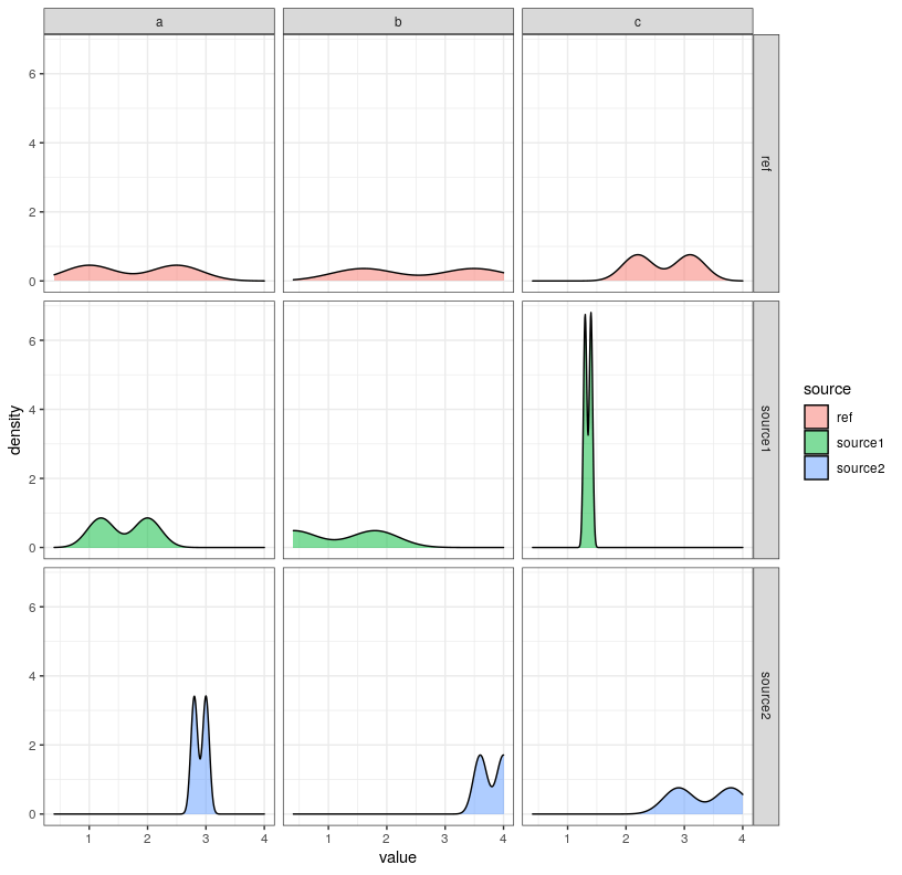 But what I really want, based on this example, is to have only two rows, corresponding to source1 and source2 and add another density curve in each of the plots based on the values from ref.