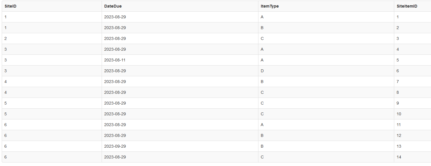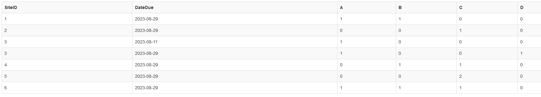 SiteID | DateDue | A | B | C | D
