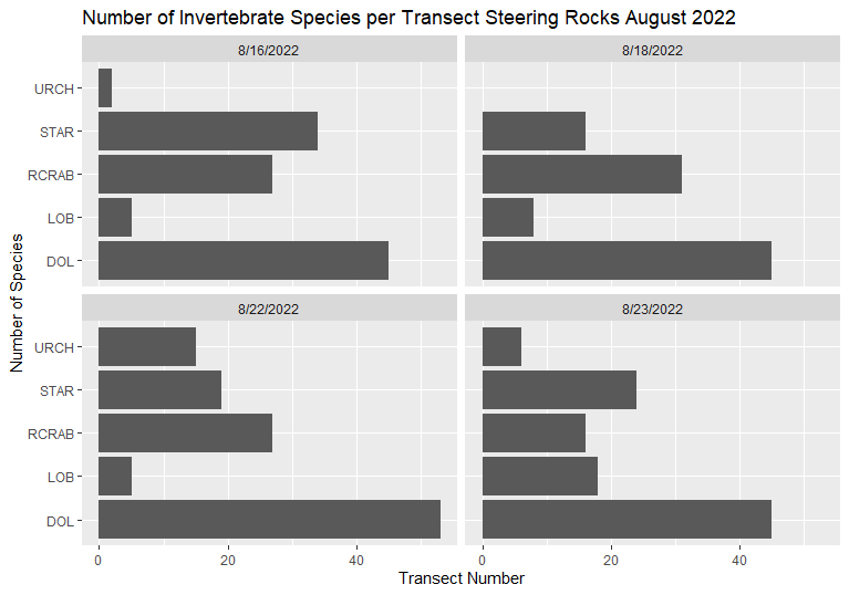 labs(title="Number of Invertebrate Species per Transect Steering Rocks August 2022",