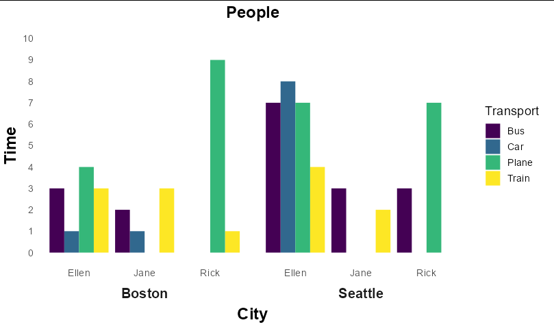 I want a ggplot that looks in this way: City on the X axis, Time on Y axis, and the value of each column filled with the different transport. But I would like to have the data on the X axis also grouped by person. So far I’ve wrote: