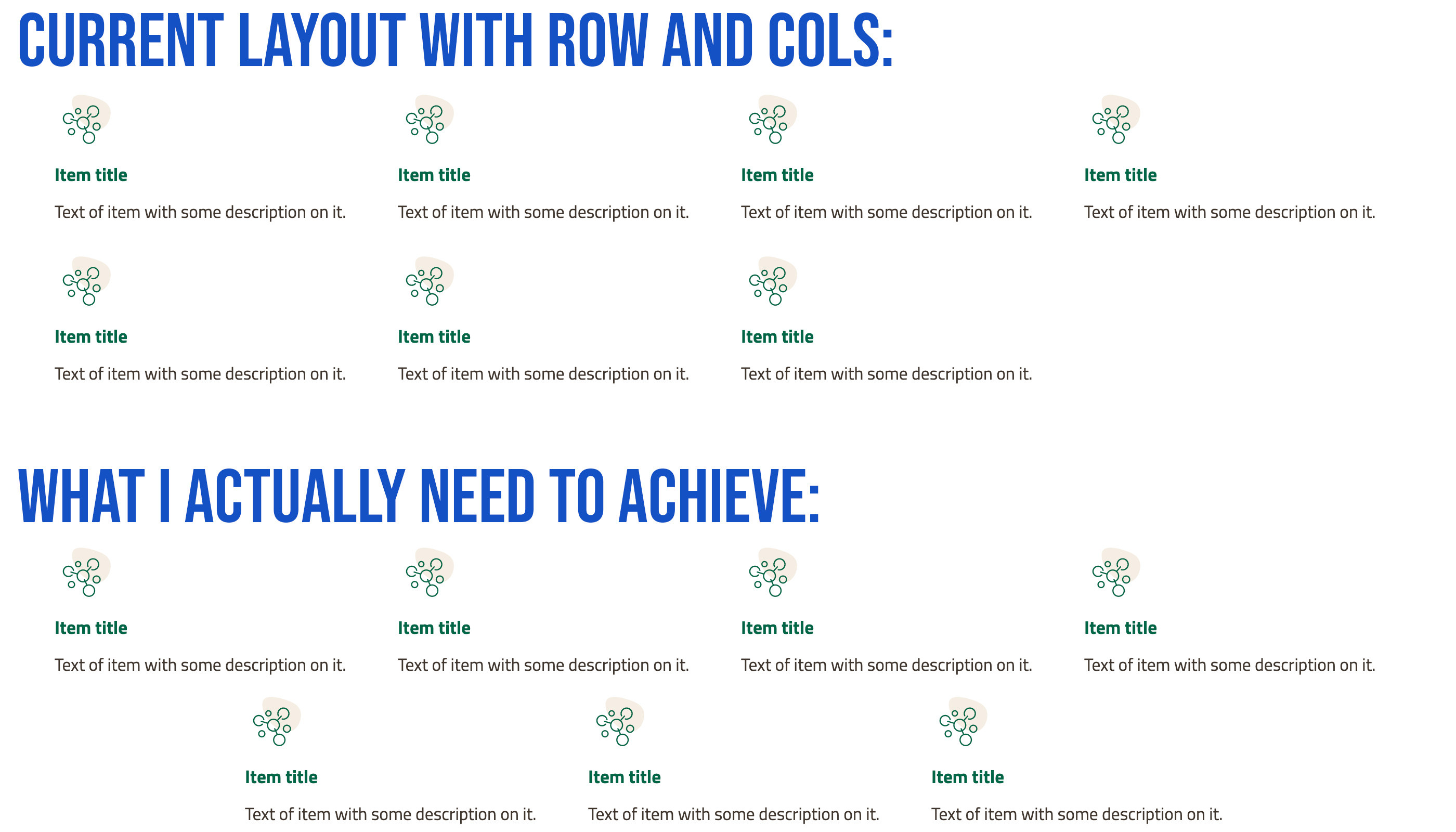 The issue is that the bottom row should be centered, but since the previous row already has 4 columns that seems an impossible task with default Bootstrap 5 helpers.
