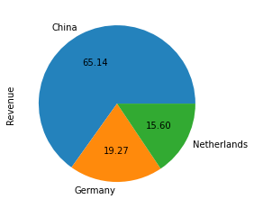df_country["Revenue"].plot.pie(autopct="%.2f")