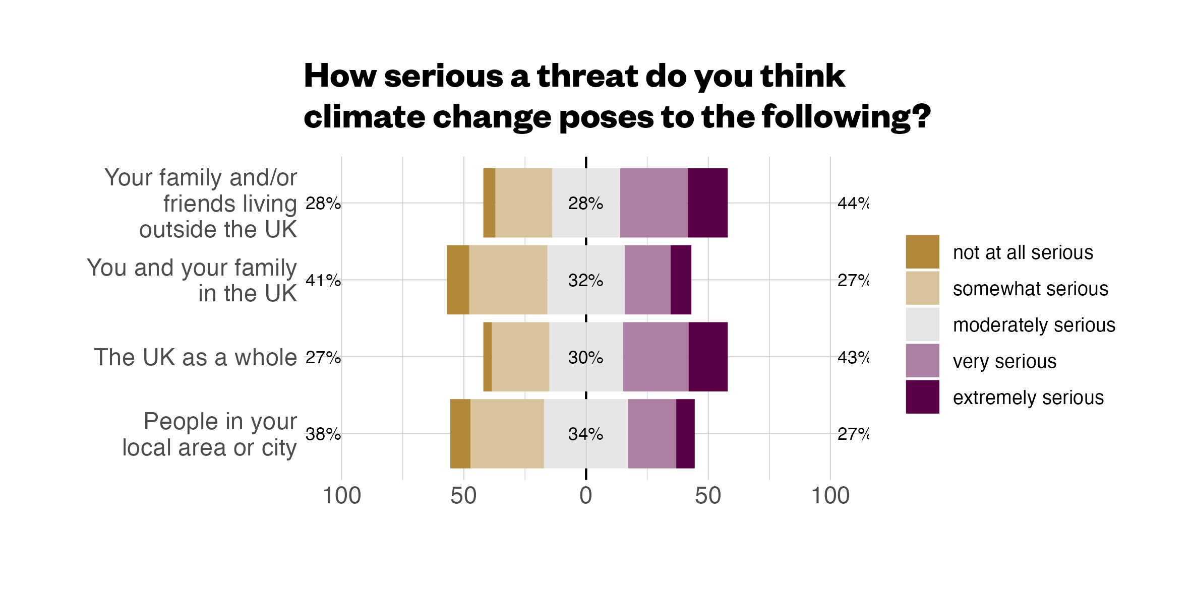 labs(title = "How serious a threat do you think \nclimate change poses to the following?", y = "") +