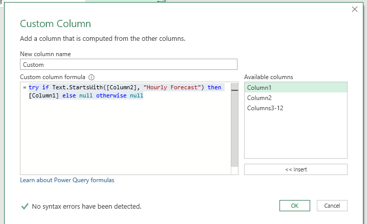try if Text.StartsWith([Column2], "Hourly Forecast") then [Column1] else null otherwise null