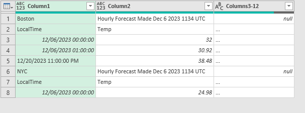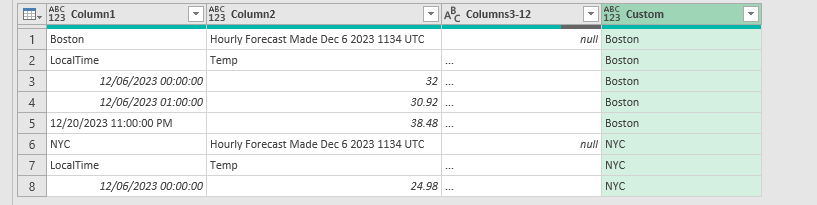 Simply removing the first row, promoting the headers from the second row and then filtering all other "non-forecast" values is easy. What I would really like to do is figure out a way to add the city name to a new column, so that I get this end result: