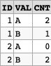 Now I need somehow to get to the result that id 1 has 2 occurences of A and one of B. Id 2 has 0 occurences of A and 2 occurences of B.