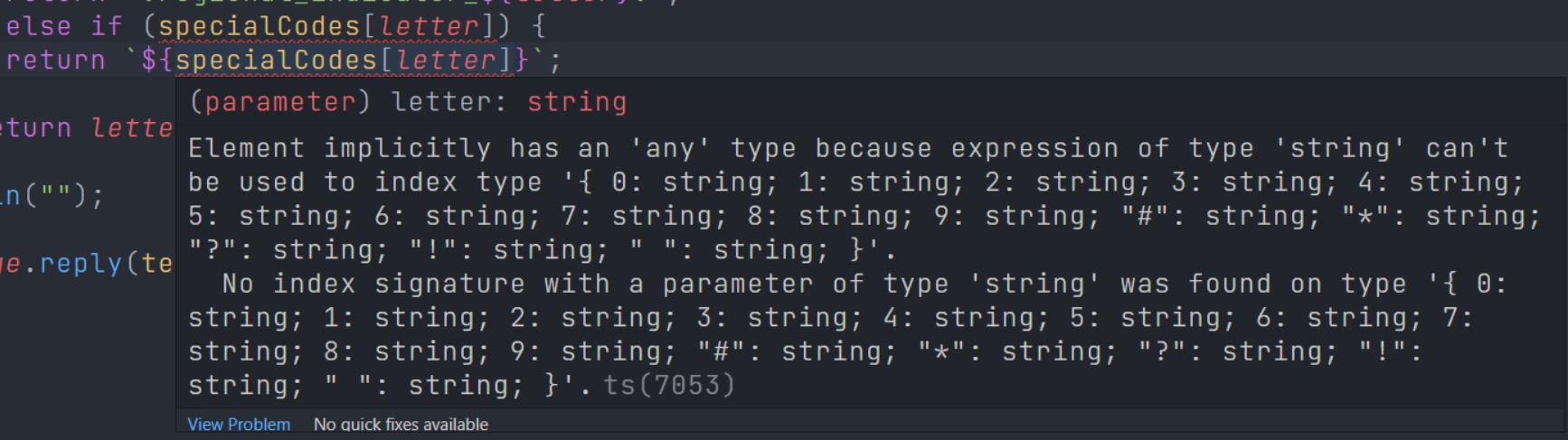 I am getting an Error in specialCodes[letter] saying Element implicitly has an ‘any’ type because expression of type ‘string’ can’t be used to index type and No index signature with a parameter of type ‘string’ was found on type