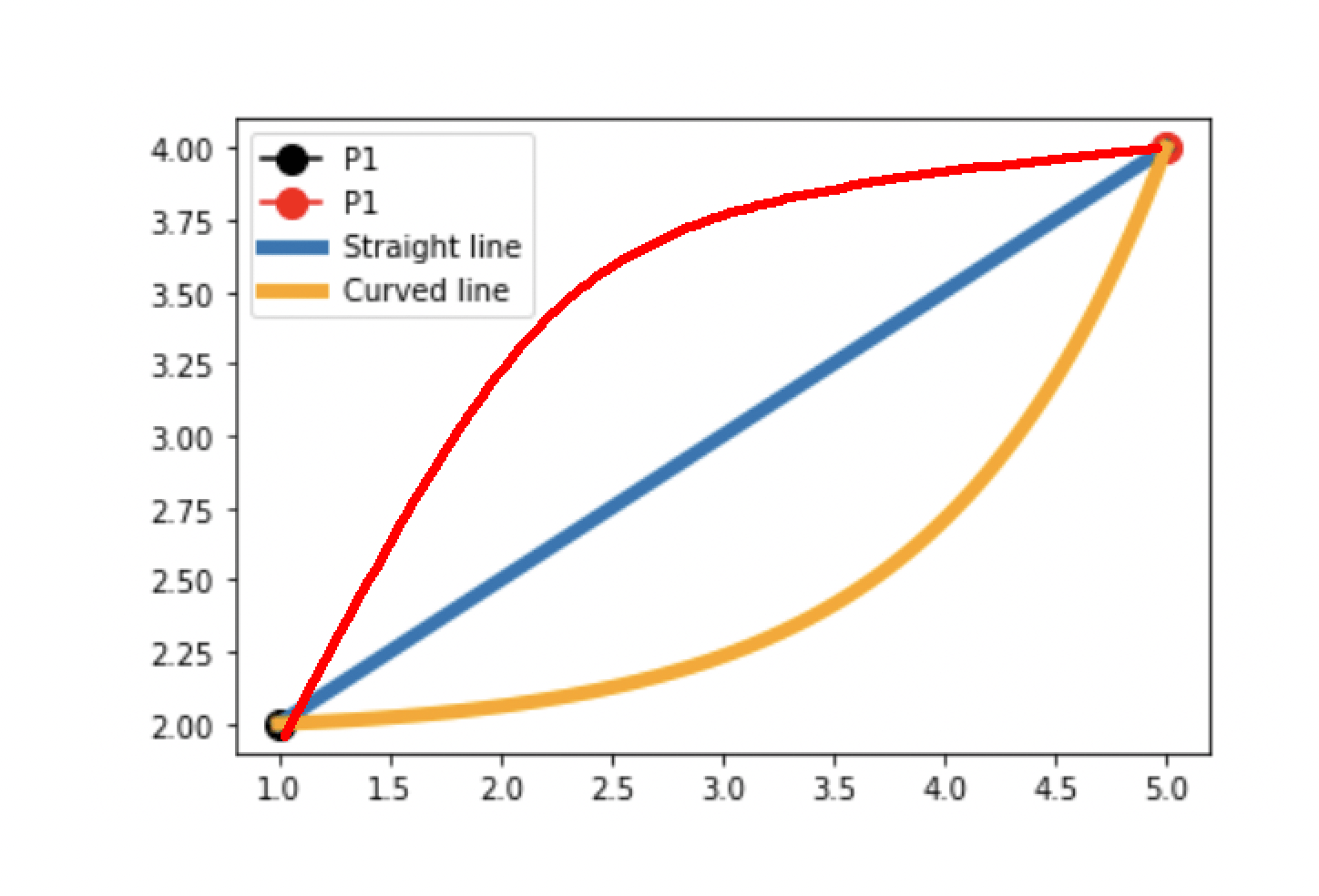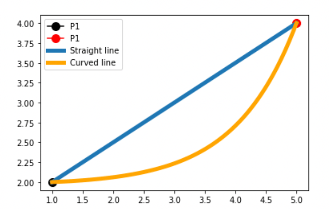 I want to plot straight line and curved line between these two points in Python. To draw the curved line, I have created a function called draw_curve which looks as follows: