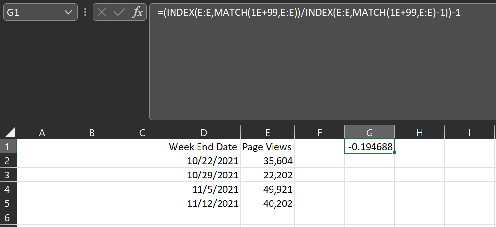 I have a table, which you can find below, and I was hoping to calculate the WoW (Week over Week) percentage of the last two rows of the table. The calculation I use for percent change is =(E5/E4)-1