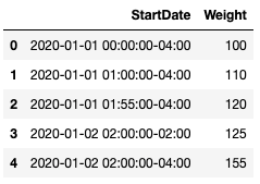 I want to group the data by the hour and sum up the Weight column. So, the end result would be a df with 3 rows: current index 0, current indexes 1&2, current indexes 3&4.