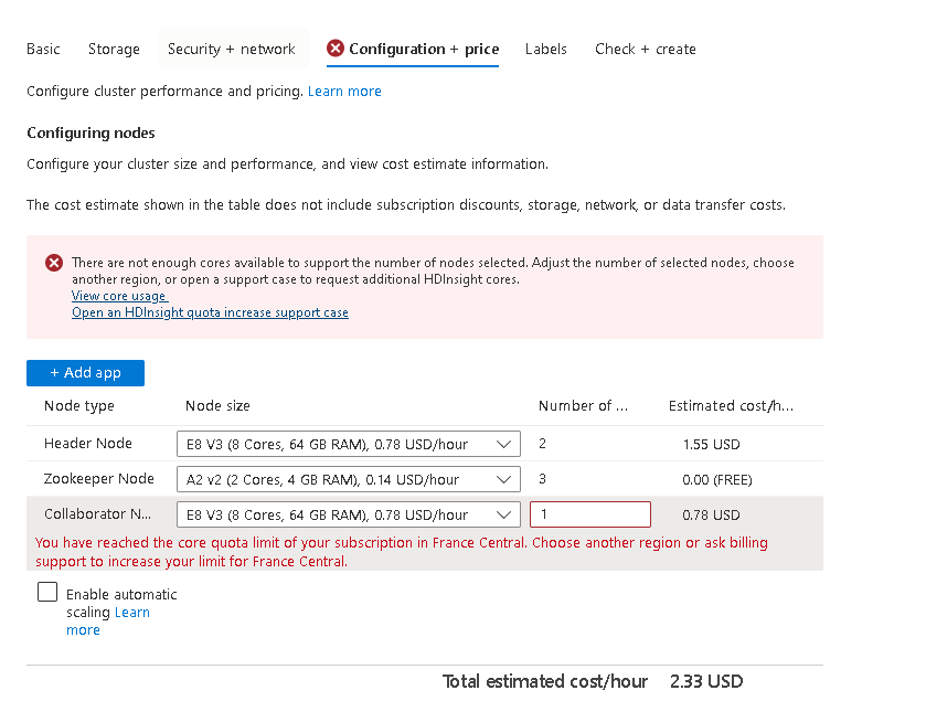 "You have reached the core quota limit of your subscription in France Central. Choose another region or ask billing support to increase your limit for France Central".
