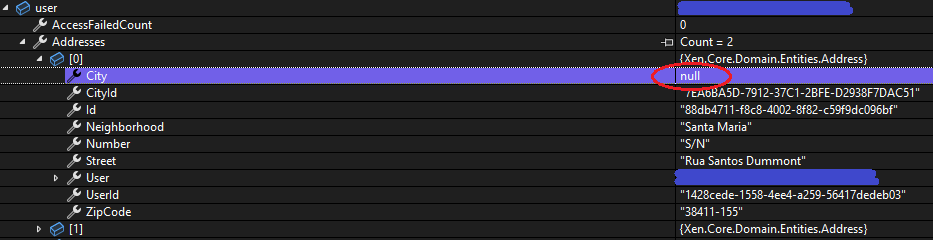 City = address.City.Name, // PROBLEM: The city is null, was not loaded.