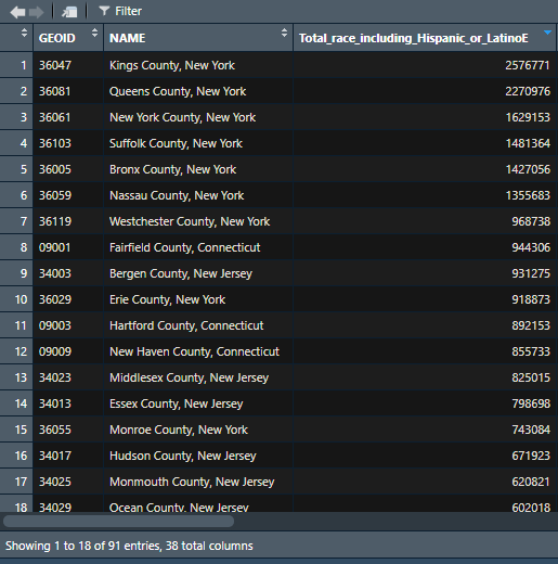 For instance, here’s my dataframe ordered by most populated counties: