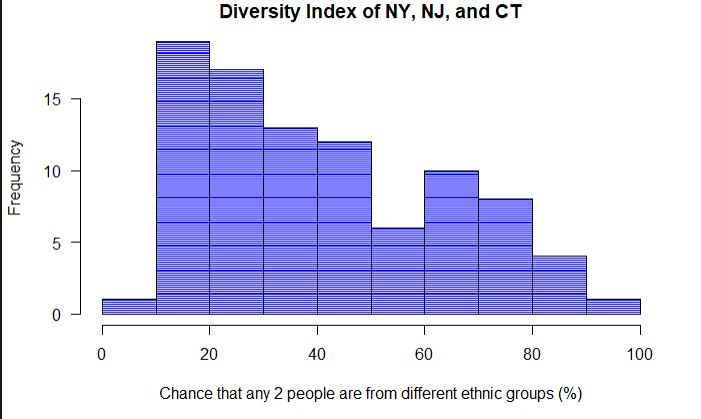 hist(race_counties$DiversityIndex, main = "Diversity Index of NY, NJ, and CT", las = 1, xlab = "Chance that any 2 people are from different ethnic groups (%)",