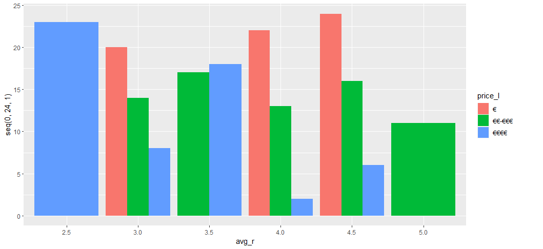 I want to plot a grouped barplot with the values avg_r and price_l , but based on the frequency of price_l.