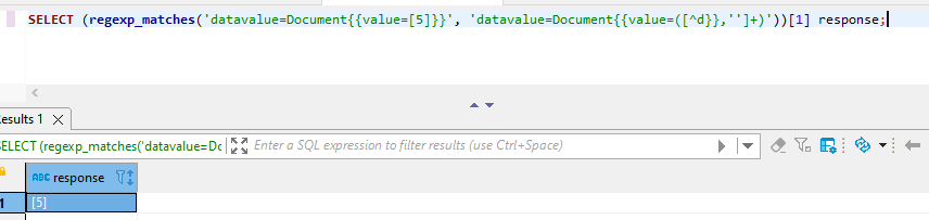 SELECT (regexp_matches('datavalue=Document{{value=[5]}}', 'datavalue=Document{{value=([^d}},'']+)'))[1] response;