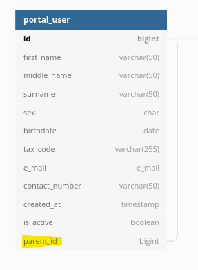 The highlighter parent_id contains the FK that define this recursive relationship. So it contains the PK of another user that is the parent.