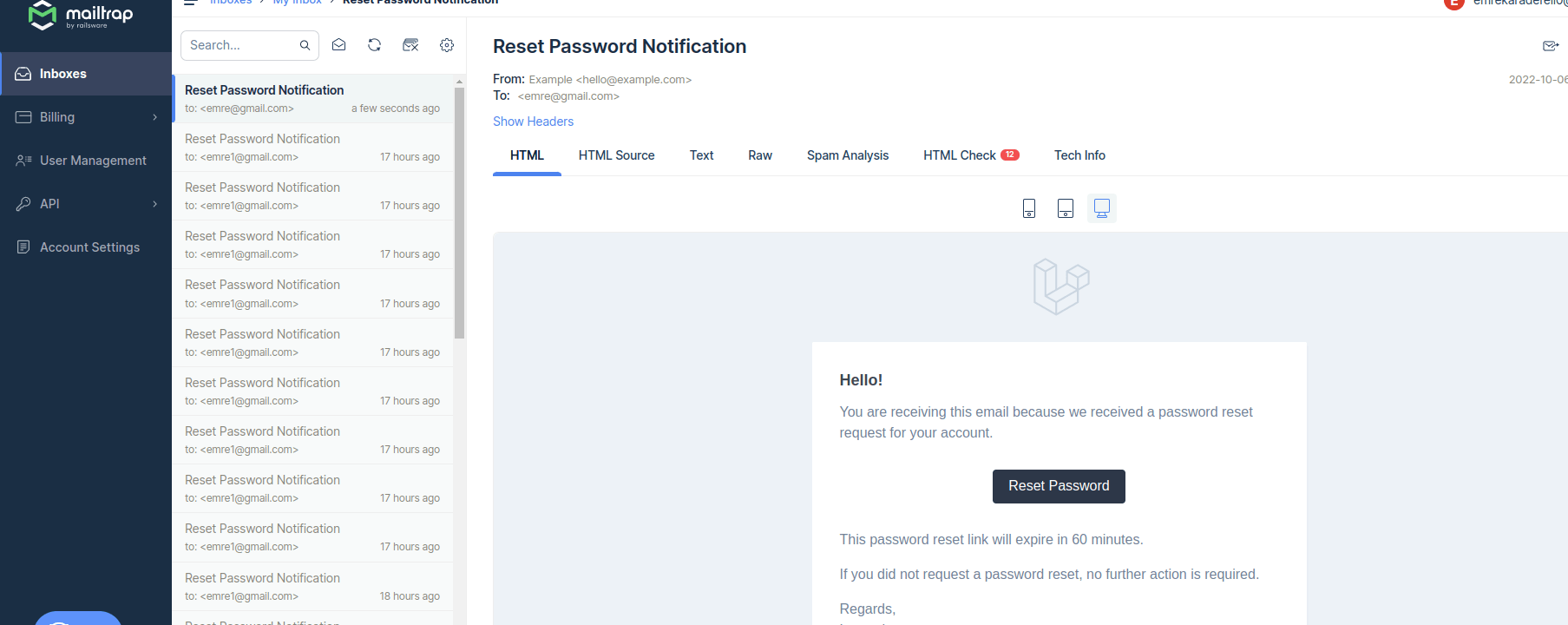 Password reset link comes here. I dont want that. It has to send reset link to user’s email not my mailtrap account.