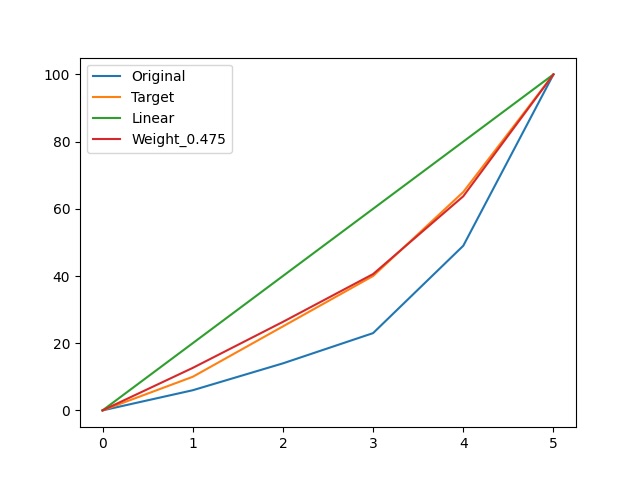 df[f"Weight_{weight}"] = df["Original"] * (1 - weight) + df["Linear"] * weight