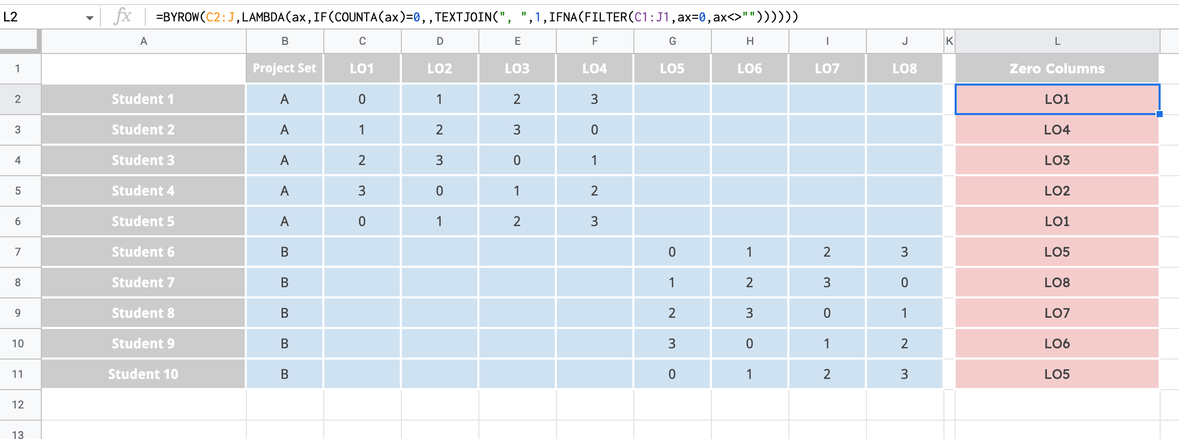 At the end of each row, I’m trying to create a list of the objectives where the student scored zero marks.