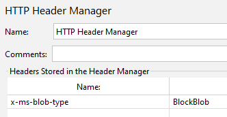 I’ve got a test fragment that makes a few requests, which work fine. I now want to add a new PUT request that uploads a file to a an azure storage account container. I currently get a 400 with an error that a mandatory header hasn’t been included. After a little research it appears I need the ‘x-ms-blob-type’ header with a value of ‘BlockBlob’.