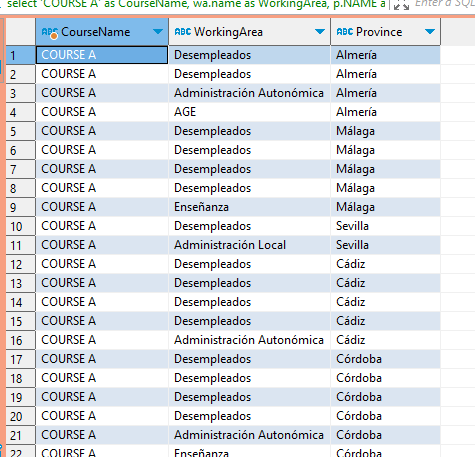 | COURSE A | Desempleado | Almería | 2 |