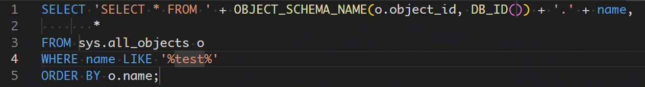 SELECT 'SELECT * FROM ' + OBJECT_SCHEMA_NAME(o.object_id, DB_ID(${20:})) + '.' + name,