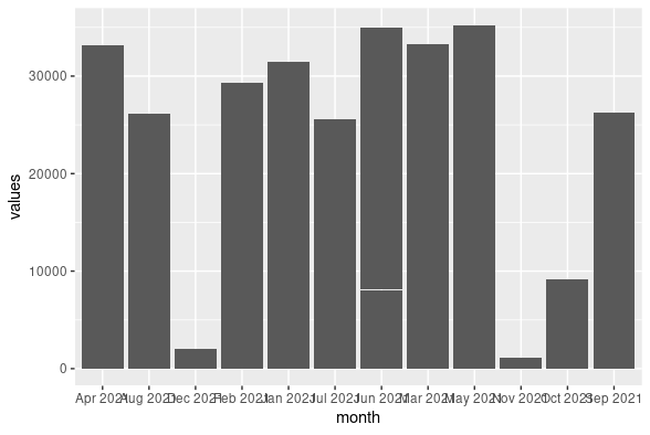 ggplot(test, aes(x = reorder(month, my(month)), y = values)) + geom_col()