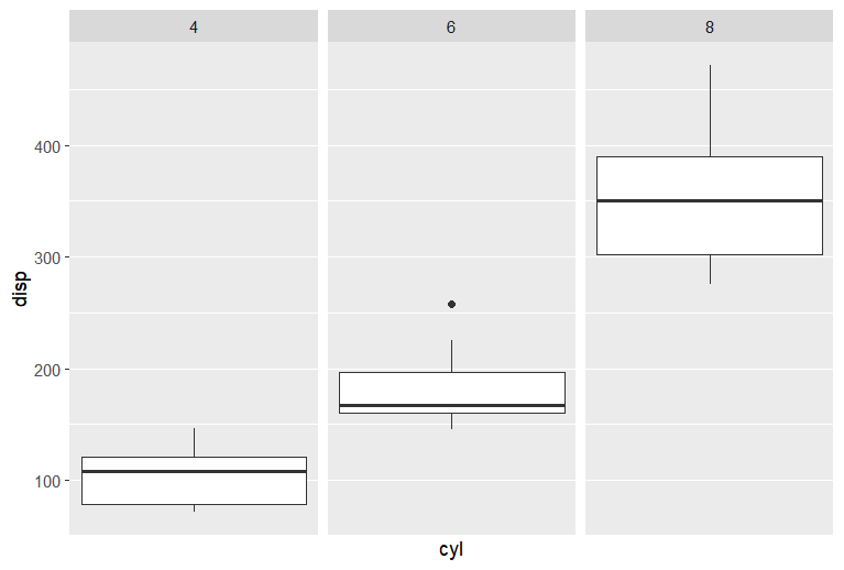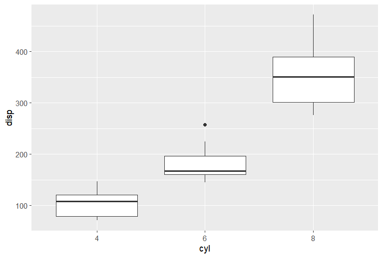 ggplot(mutate(mtc, cyl = factor(cyl)), aes(cyl, disp, group = cyl)) +
