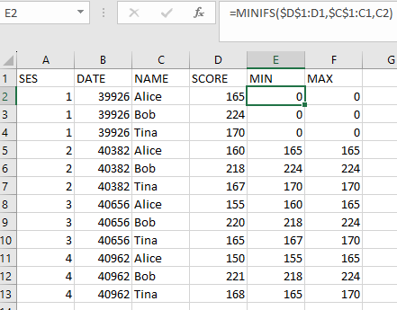 For min in E2 and dragged down: