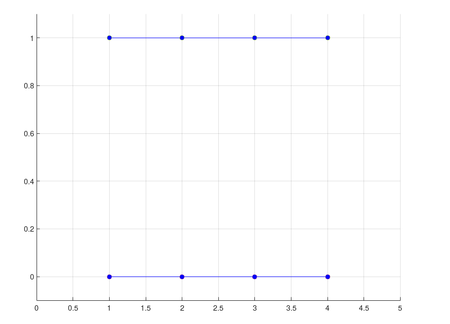 scatter(x,ones(size(x)),'MarkerFaceColor','b') % Points: (1,1),(2,1),(3,1),(4,1)