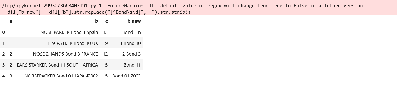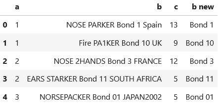 df1["b new"] = df1["b"].str.replace("[^Bond\s\d]", "").str.strip()