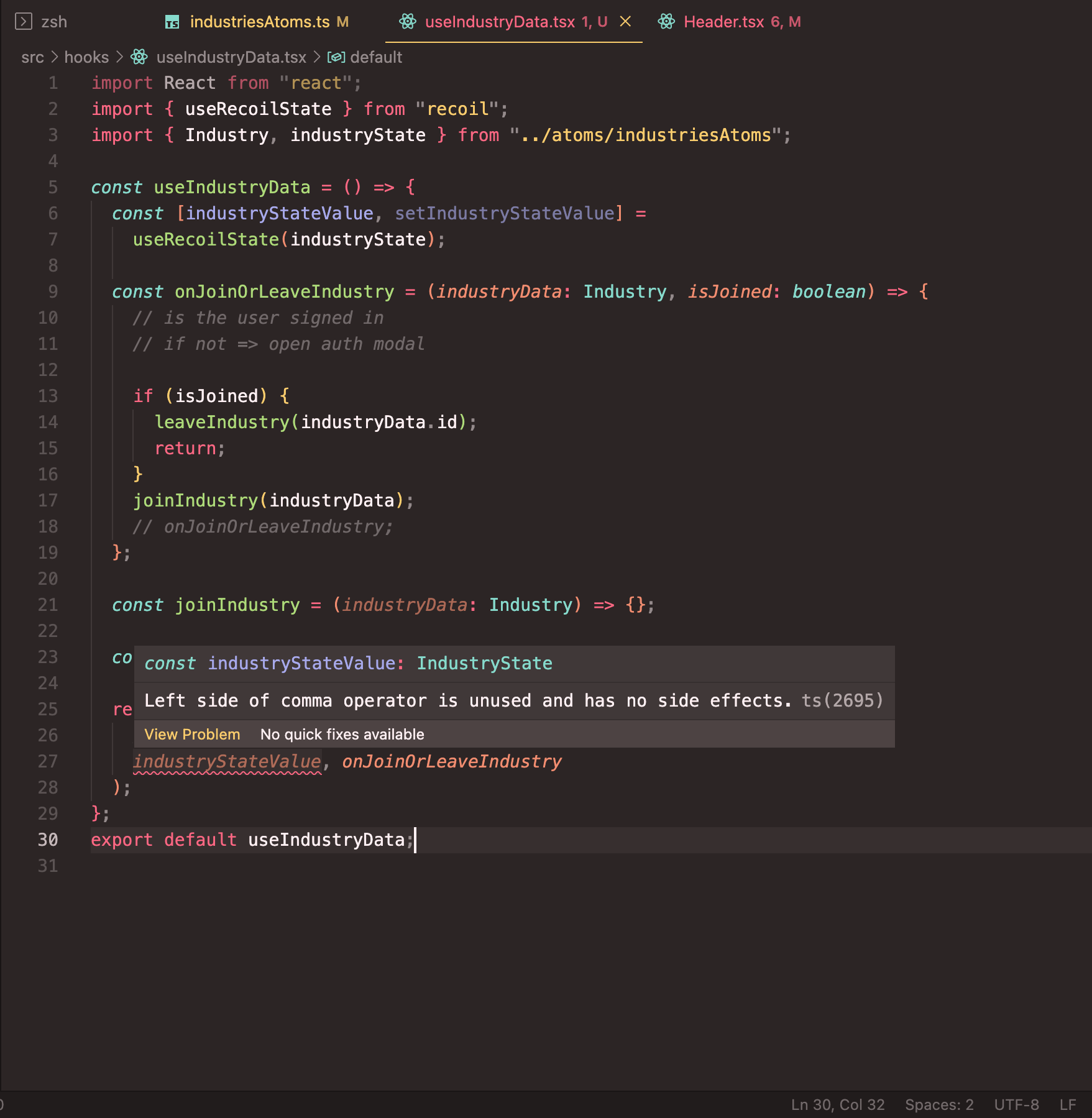 I am working on the code above in a react project and I’m getting an error that Left side of comma operator is unused and has no side effects.ts(2695) in line 27 of the screenshot.