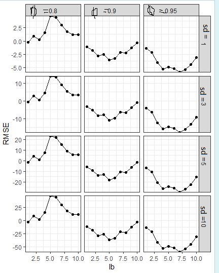 ggplot(NEWDAT, aes(x = x, y = y)) + geom_line() + geom_point() + labs(x = 'lb', y = 'RMSE') + facet_grid(sd ~ phi, scales = "free_y") +