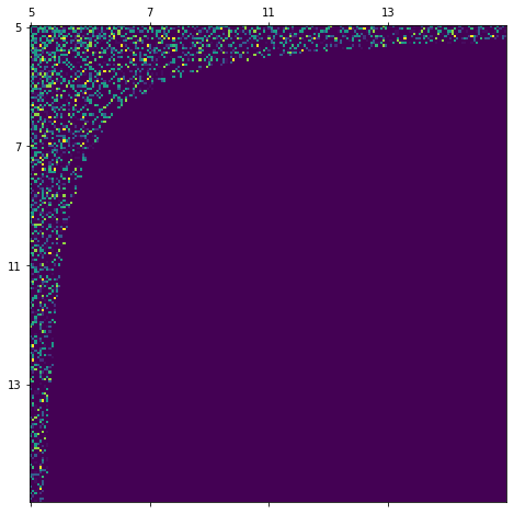 Unfortunatelly the axis labeling is not correct since each axis should span the primes from 3 to 1229. How can I fix the axis labeling? I am not requiring to place each of these 200 primes as axis label (displaying a few labels would be fine).