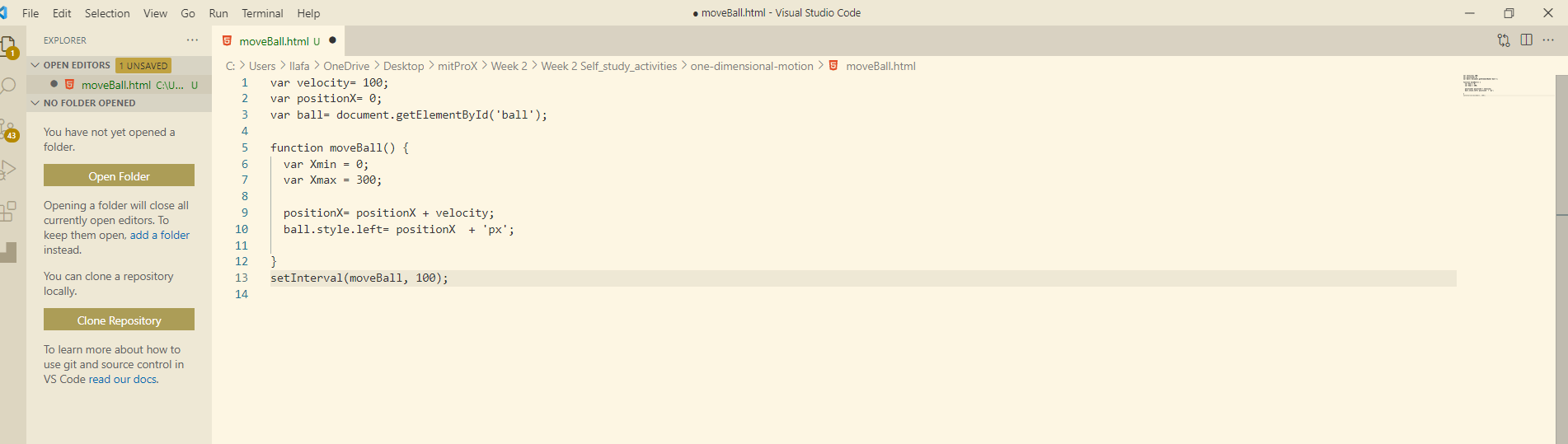 I have declared my global variables, followed by a function to move the ball, then followed by a setInterval. However, I can’t seem to figure the right way to reverse the ball that continuously moves to the right of my screen until no longer visible. Is it a matter of a type of reverse method or setting up conditions?